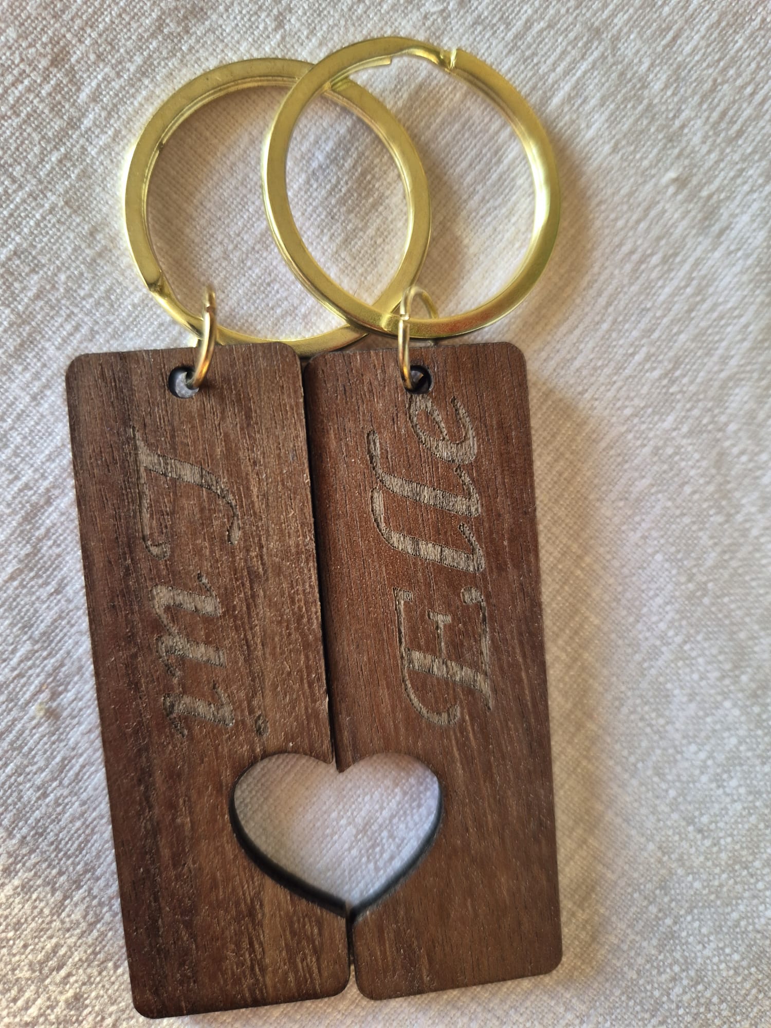 Chaque moitié porte l’inscription Lui et Elle, et ensemble, elles forment un joli cœur.